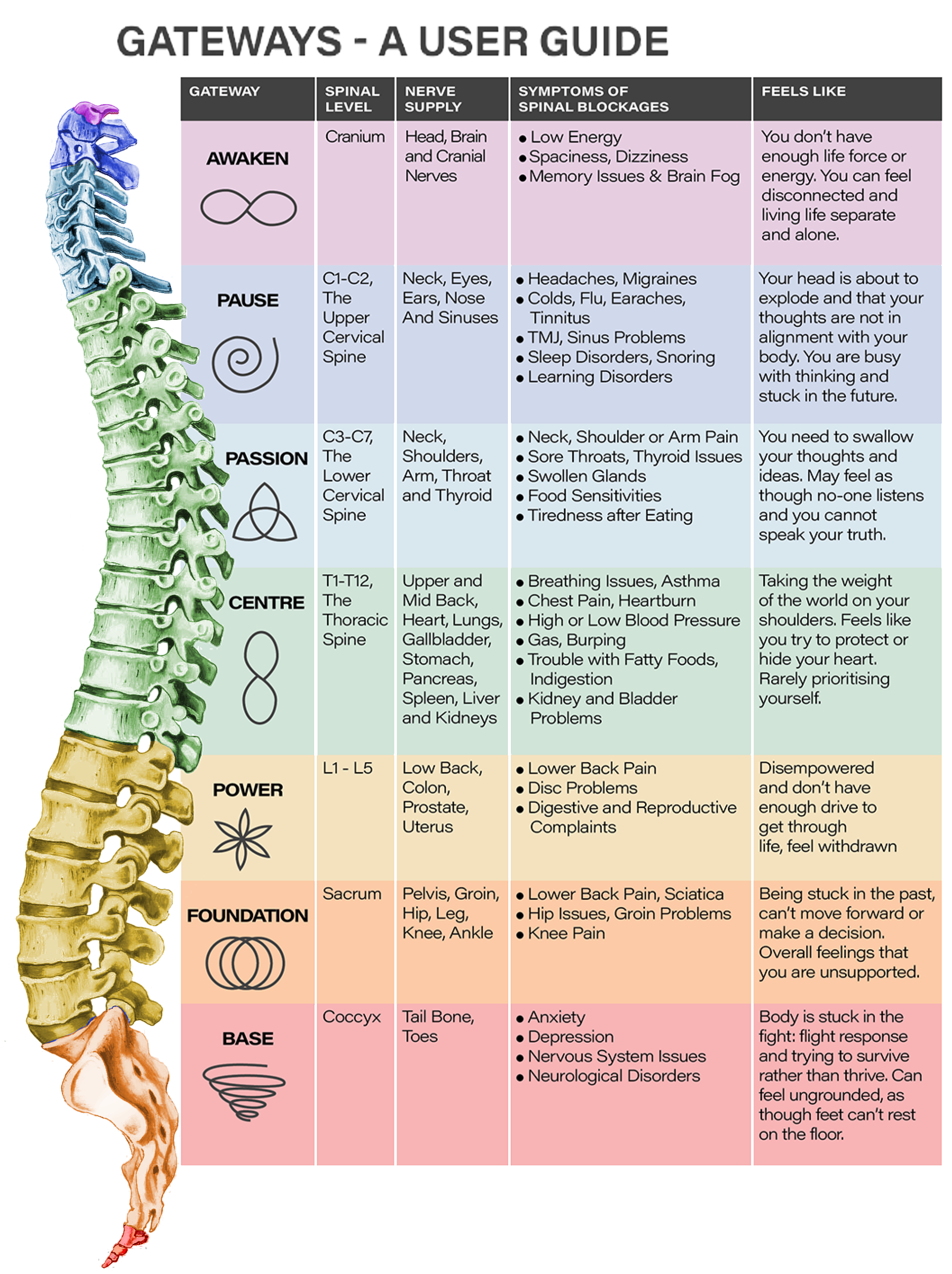 For reference, the table below shows the location of these seven gateways along the anatomy of the spine and the parts of your body that are associated with them.